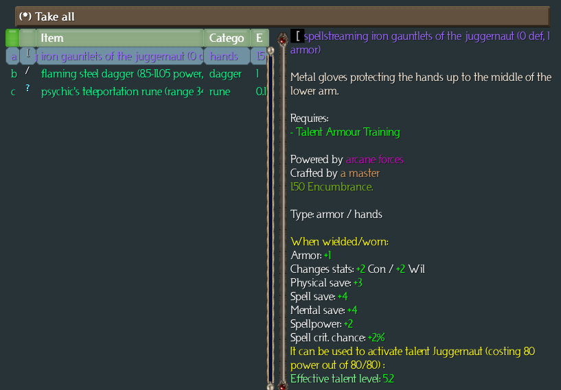 These were dropped by a gelatinous cube. The gloves don't have the healing and Life regen penalty of our current gloves, so we wear the new ones. We'll probably never remember to use the Juggernaut ability, but at least we'll heal at normal speed now. The teleport rune has a slightly lower cooldown than the one we bought in Elvala, so we swap that in too.
