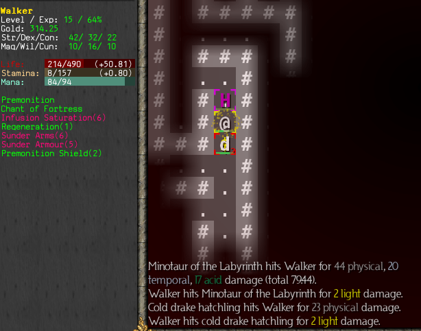 We make a regular attack against the minotaur (52 damage), and he uses Sunder Arms, which we also resist. Premonition pops up a shield against temporal damage. Temporal? Yeah, temporal... he must have a paradox weapon. The log also says we're taking acid damage from him -- both from his attacks, and from retaliation (in addition to temporal retaliation). Sounds like he's got a weapon with two greater egos (acid and temporal on-strike and retaliation). Well, we'll just have to kill him, won't we?