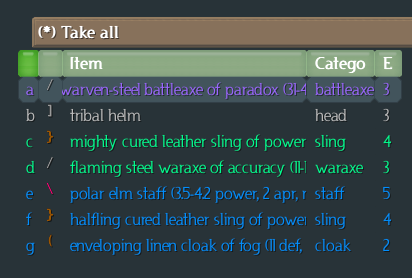 There's that axe he was using on us -- caustic dwarven-steel battleaxe of paradox (31-46.5 power, 2 apr). It would be a really nice one for a class that preferred two-handed weapons. The cloak is an interesting swap-in item, as it has 11 Defense, 11% light resist, and 11% fire resist, but it has negative confusion resist and light radius. (Also a stealth bonus, but we have no stealth.)