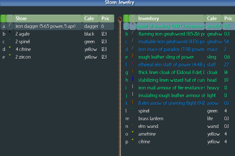 We'll keep the amulet (it's light), and the gems (weightless). Out of the remaining gear, only the Eldoral cloak and the hat of cunning are useful; so we'll keep those as well. Everything else gets sold. Don't forget the brass lantern and the elm wand, hiding in the gems.