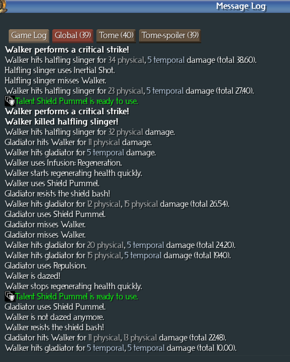That's a bit more informative. He tried to use Shield Pummel on us, but missed. Then he used Repulsion -- which is why we flew across the screen. This left us dazed, meaning we could not act for a few turns (unless attacked). The next thing we see happen is another Shield Pummel. He must have walked up to us while were were dazed, so he could have another go. His shield bash hit us, for 22 damage, but we resisted the stun. (He also took 10 points in retaliation, from our sword of paradox.)