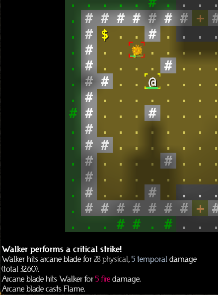This time his Flame spell hasn't hit us yet. We can dodge it, by guessing where it's going to be, and then not being there. Given our relative positions, there are two possible paths the Flame spell could take to get to us -- south first, or southeast first. It would be nice if we knew which one it would take -- and maybe some players would know that, but I don't happen to be one of them. So I'll just go one step west, which will dodge both possible paths.