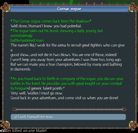 Yay, 2 more generic talent points! We definitely wanted those. We also get an achievement for doing this, and an unlock (the Arena campaign, available at character birth). For this character, though, it's only the talent points that matter.