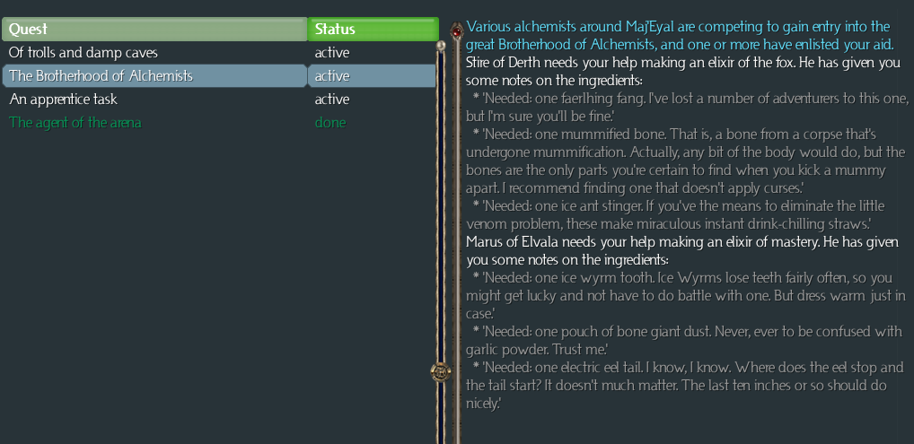 Nice ingredients this time. The orc heart will be the hardest to find, as orcs are not common until the midgame (at which point they're everywhere). The other two are quite common, and we should have them within a reasonable time frame.